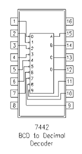 The IC 7442 is a BCD (Binary-Coded Decimal) to Decimal Decoder. It accepts a 4-bit binary input and activates one of ten outputs by pulling it LOW while keeping all others HIGH. Each output corresponds to a specific decimal value from 0 to 9. Inputs representing binary values from 10 to 15 produce no valid output (all outputs remain HIGH).