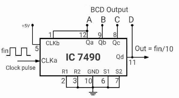 Designers typically feed clock pulses into the divide-by-2 stage and cascade the output into the divide-by-5 stage. The result is a divide-by-10 output suitable for counters, frequency dividers, and timing circuits.