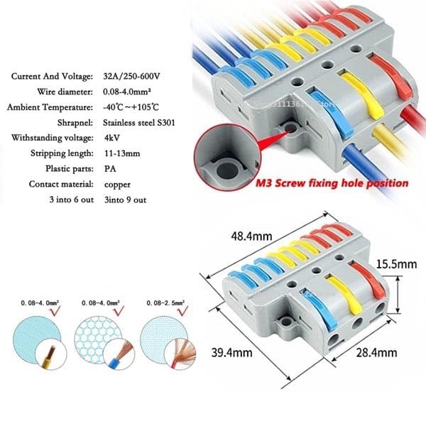 | Wire Range | Solid/Stranded: 0.08–2.5 mm² (AWG 28–14); Fine-stranded: up to 4 mm² (AWG 12) |