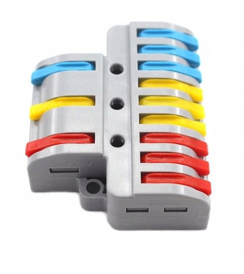 The WAGO Connector LT-933 (3 In 9 Out) is a practical multi-way push-wire connector designed for efficient power distribution and branching in electrical circuits. This connector allows you to connect 3 input wires to 9 output wires simultaneously, providing a neat and reliable solution for splitting power lines to multiple devices.